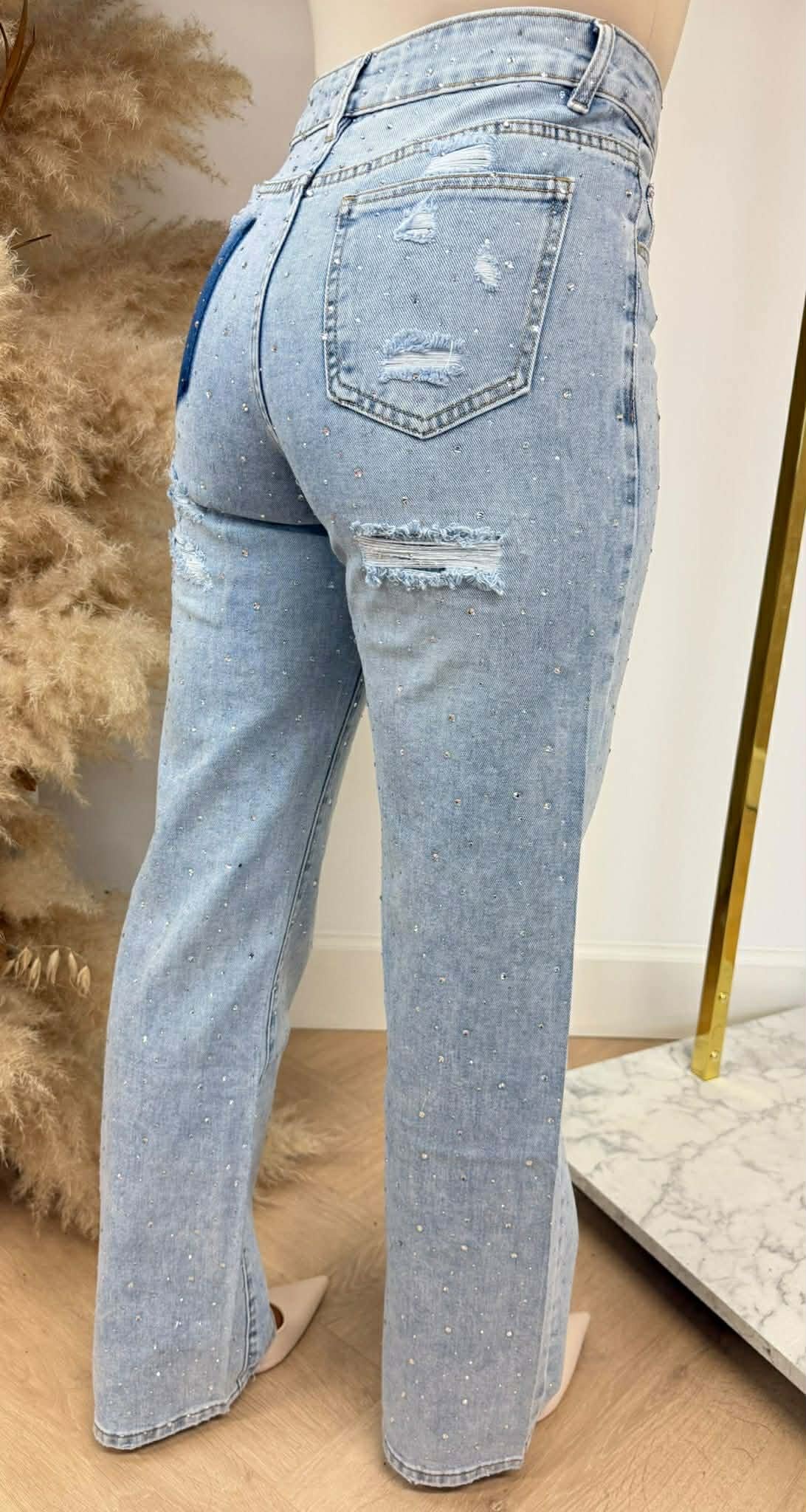 NEW, HOT & TRENDY! Deze BESTSELLER sparkle jeans is er eentje die de webshop uit vliegt.. deze wilt iedereen hebben! De jeans heeft een wide leg fit, zit vol met glitters en stretch.