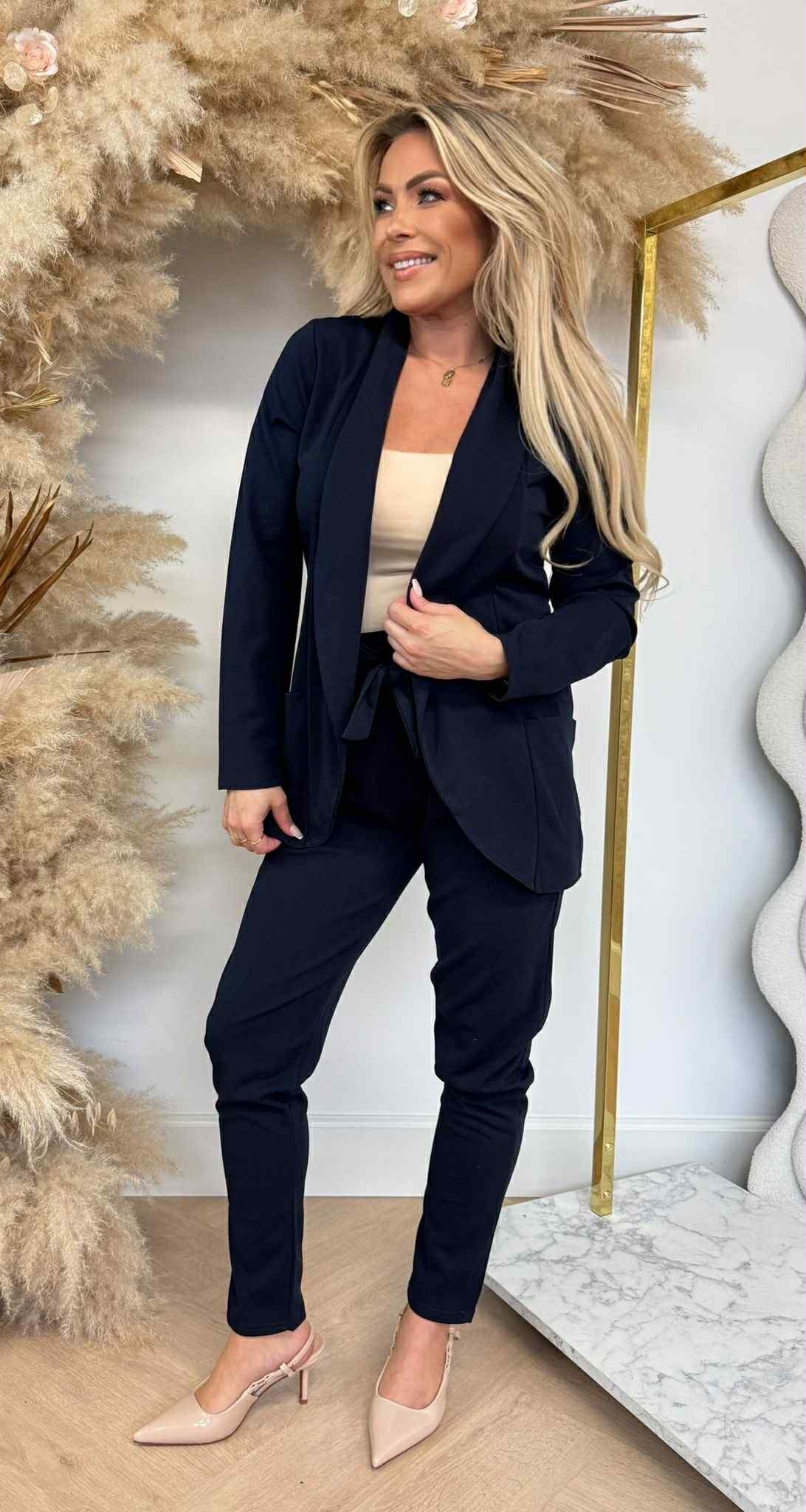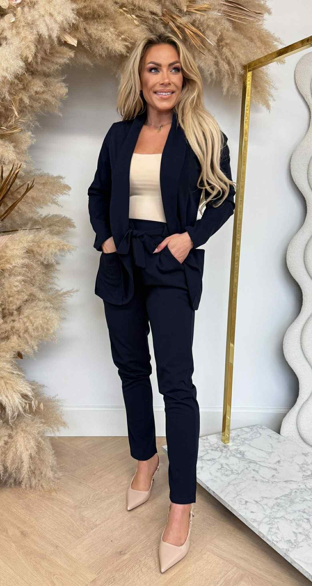 WE LOVE BASICS! // Super leuk pak die niet mag ontbreken in de kledingkast. Het jasje is ook leuk los te dragen op een spijkerbroek. De broek is gedetailleerd met een lus, en heeft een elastieken band.