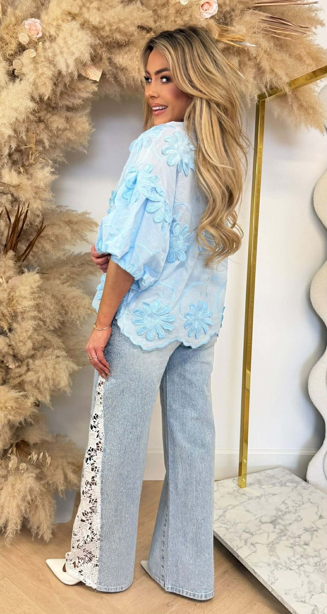 WAUW! We hebben deze super leuke blouse binnen, oh my! Gemaakt van een heerlijke stof met super leuke flower details en diamonds op de kraag!