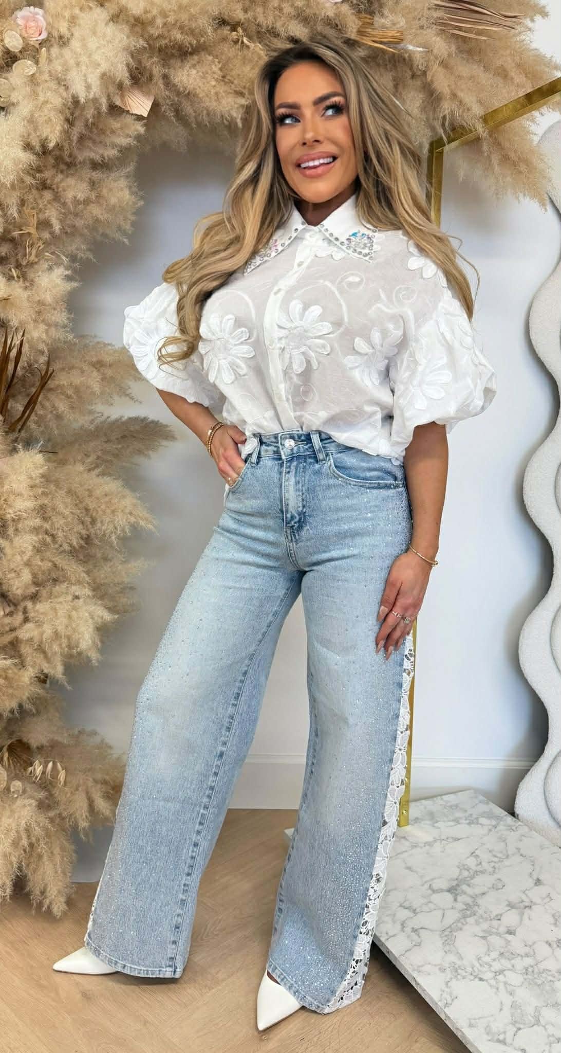WAUW! We hebben deze super leuke blouse binnen, oh my! Gemaakt van een heerlijke stof met super leuke flower details en diamonds op de kraag!