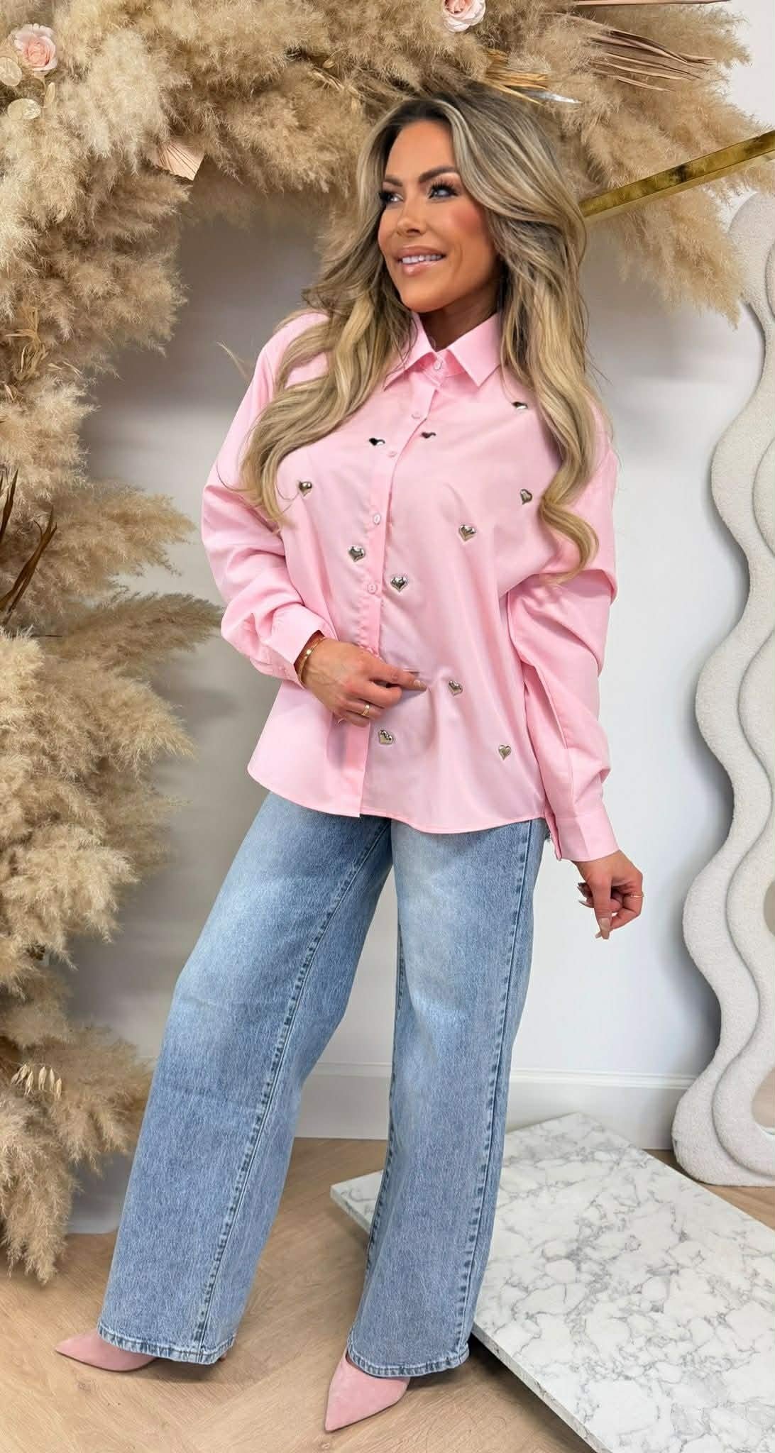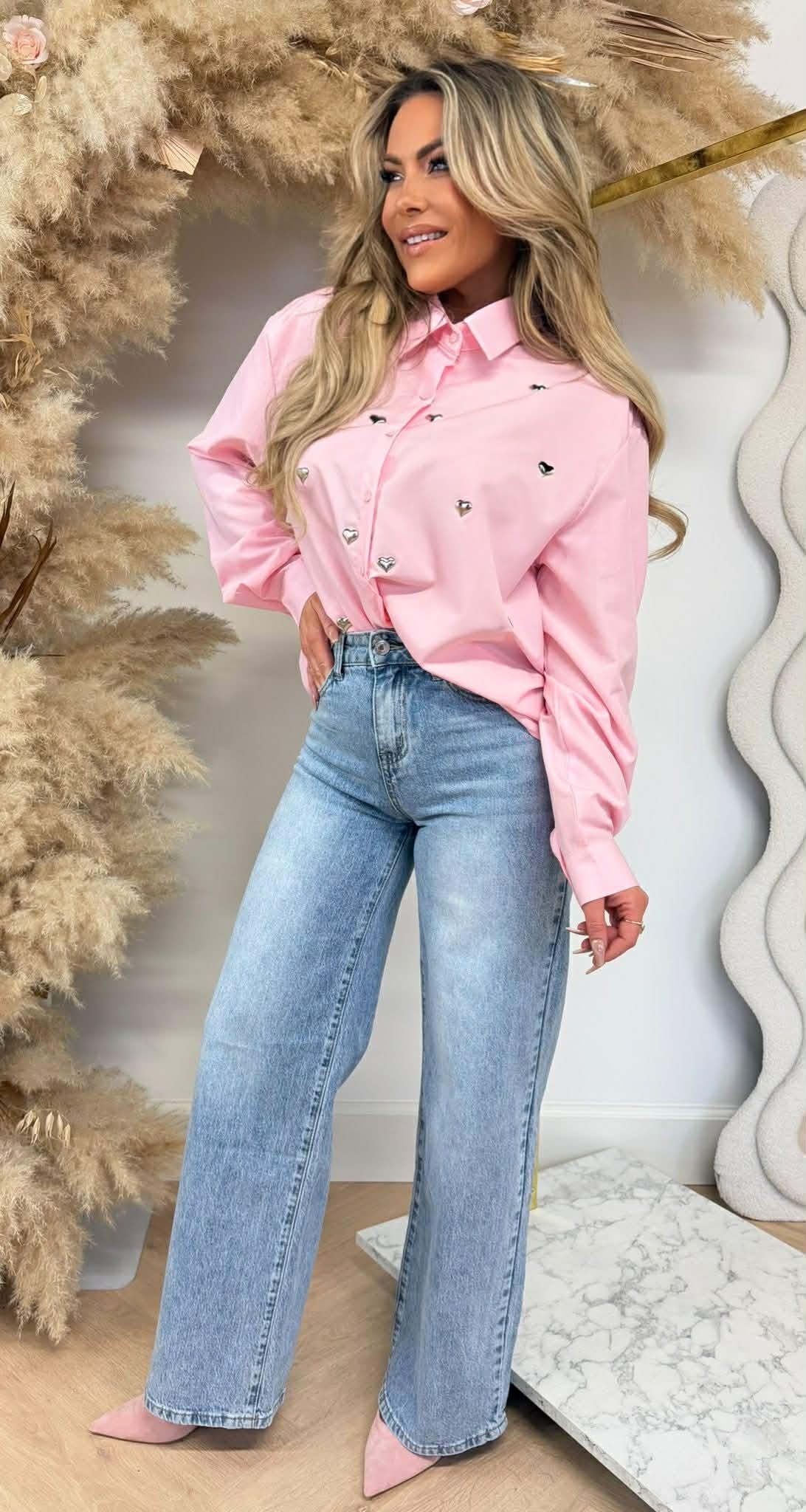 LOVE IT! Deze blouse heeft super leuke all over hartjes! Leuk te combineren met een straight jeans.