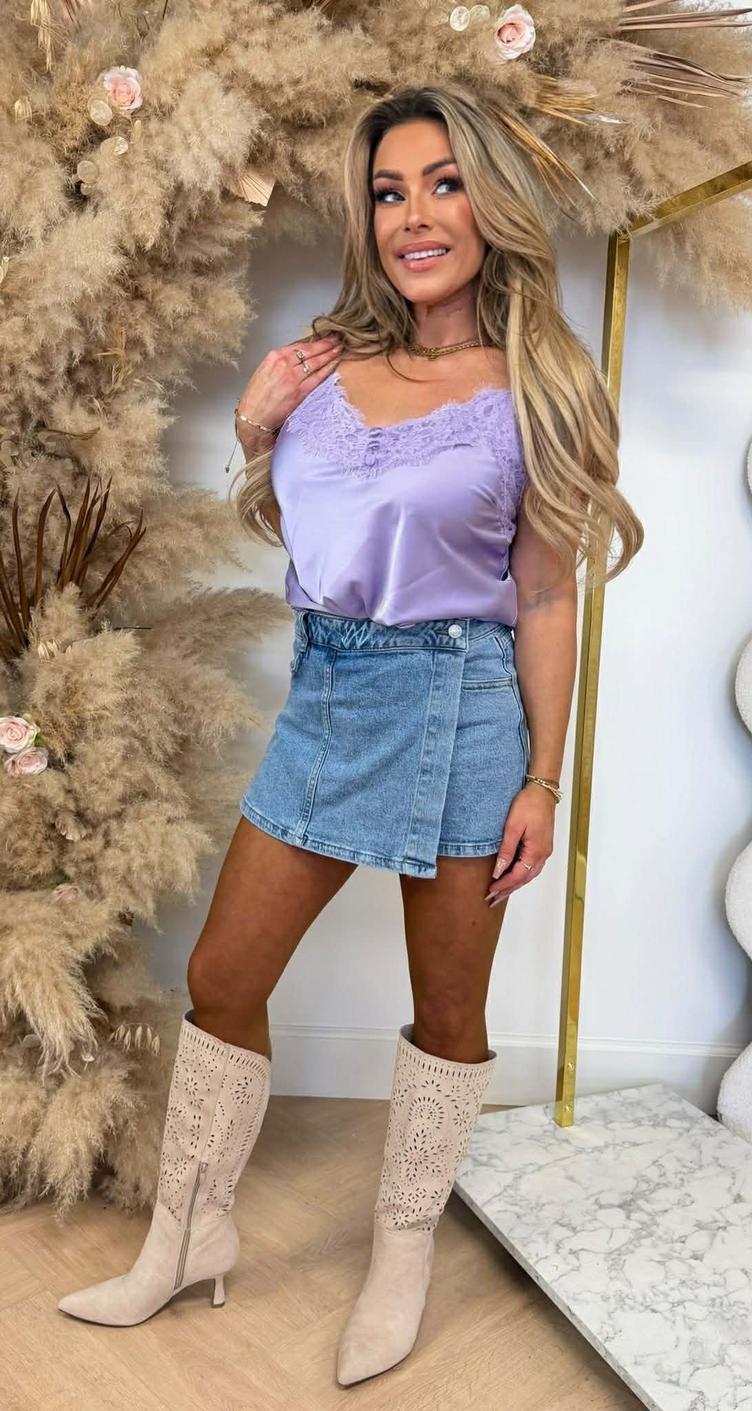 CAN'T GET ENOUGH! Het satin spaghetti lace topje is een echte musthave! Luchtig, kantdetails én verkrijgbaar in meerdere kleuren. Hurry, hurry!