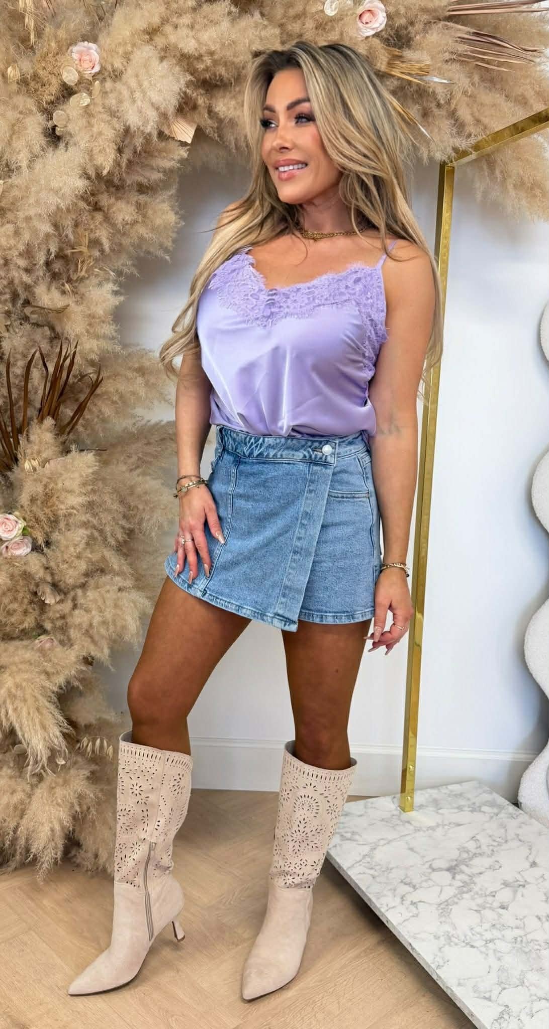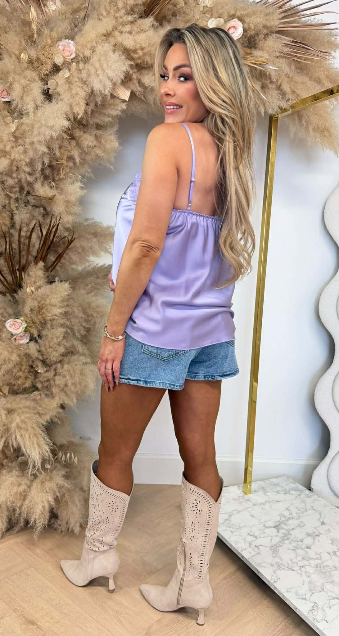 SATIN SPAGHETTI LACE TOP LILA
