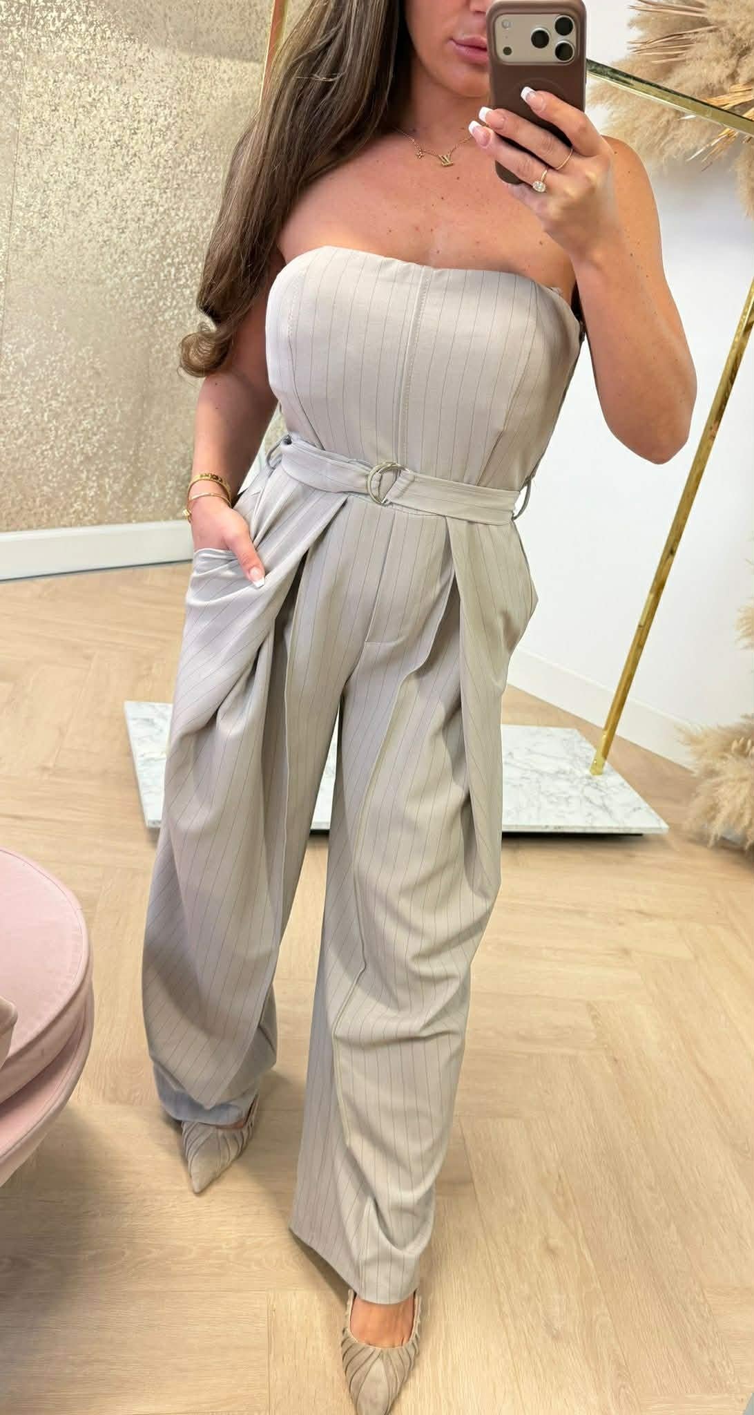 STRAPLESS STRIPE JUMPSUIT BEIGE