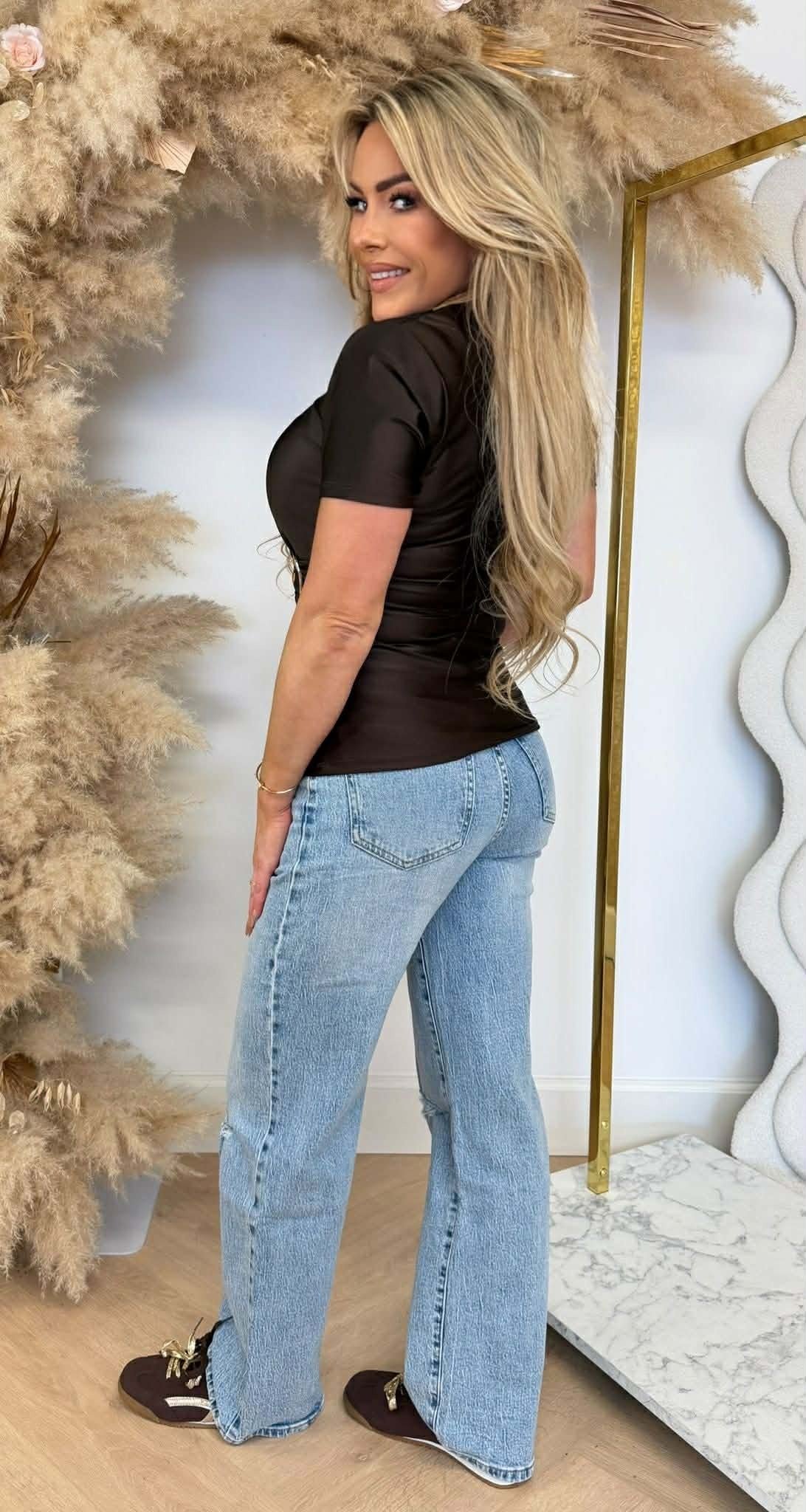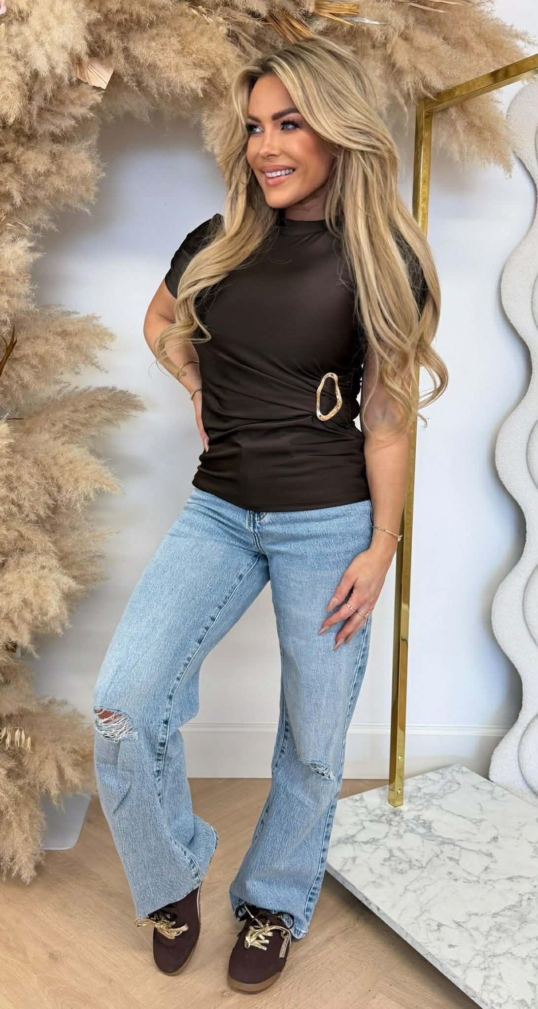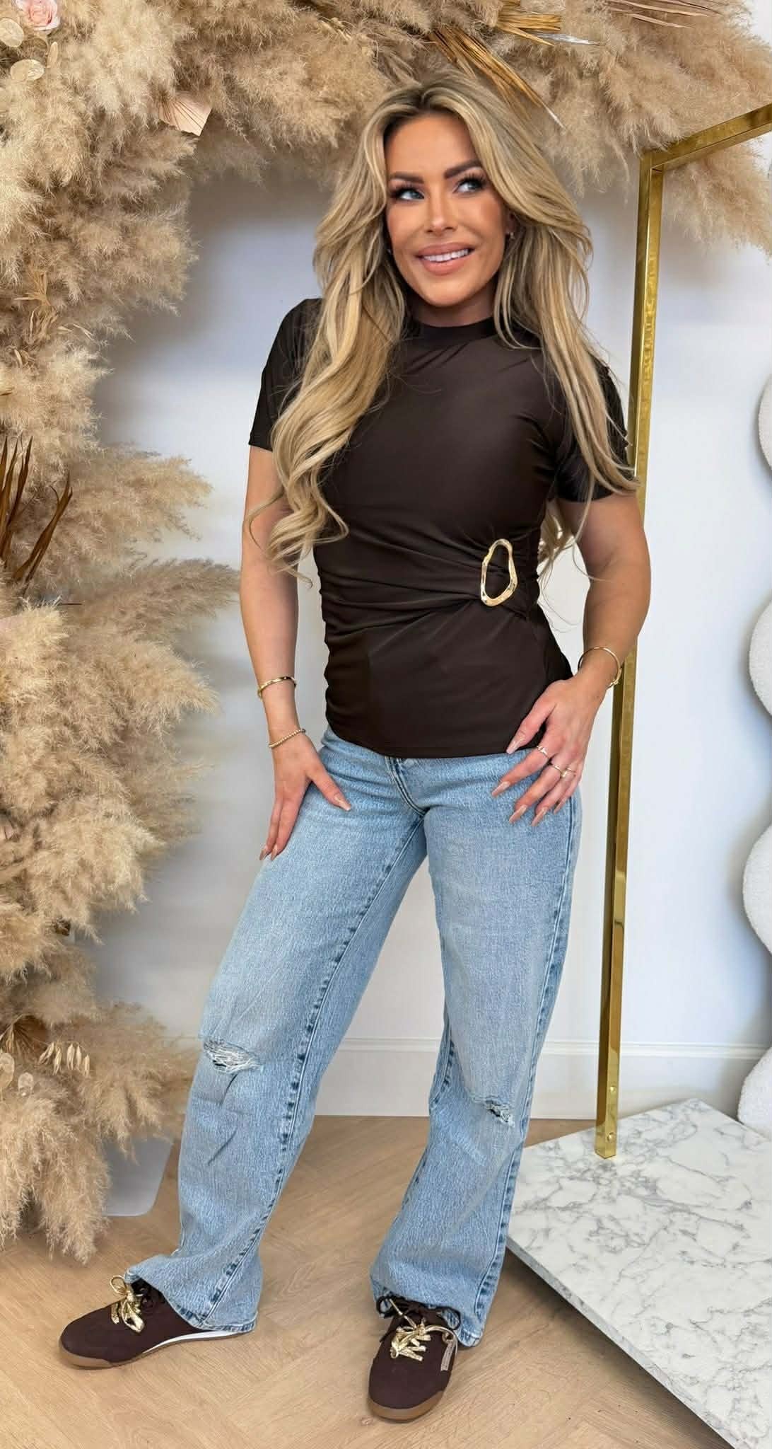 NEW! Deze geweldige top met golden details, is gemaakt van een heerlijke travelstof. Het voordeel? Kreukvrij en luchtig.