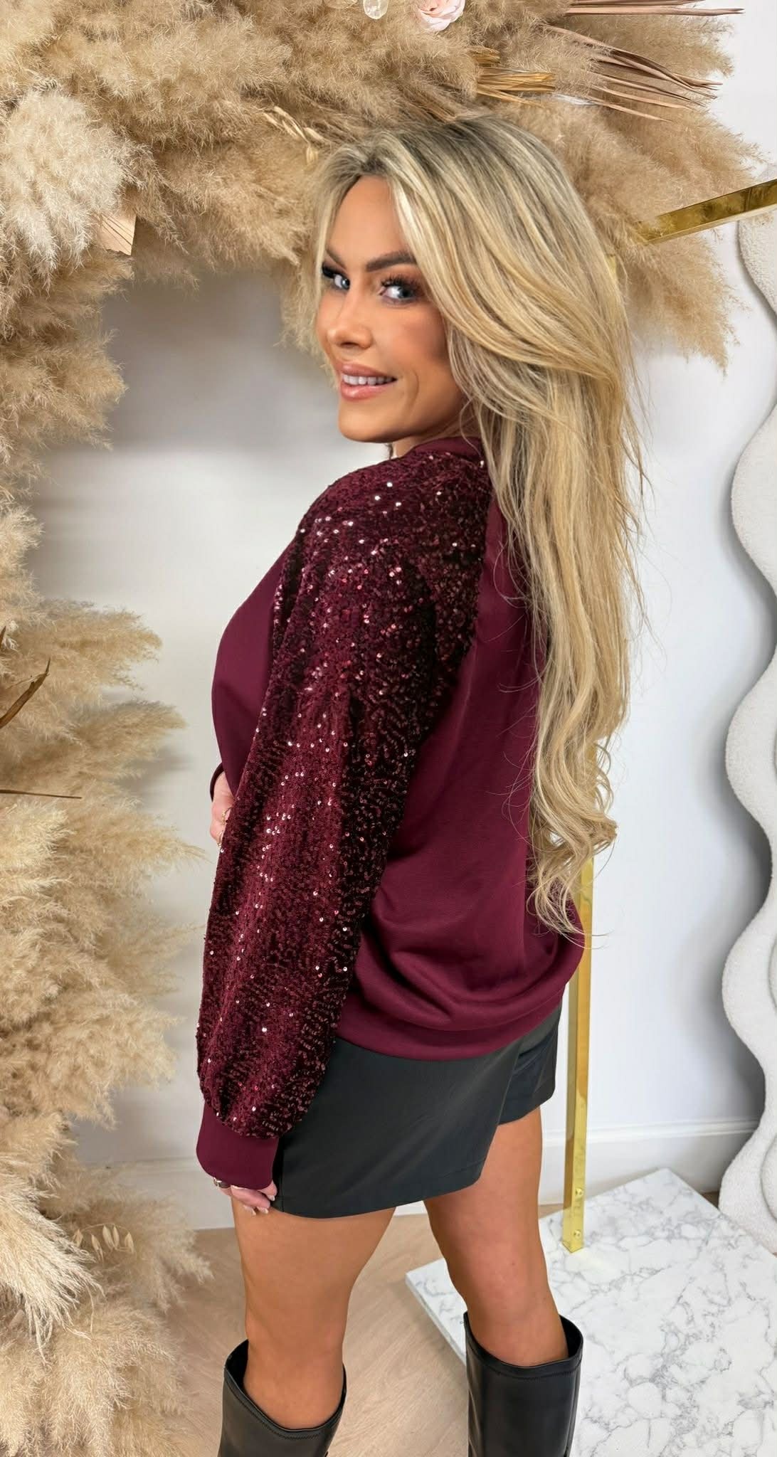 VELVET SEQUIN SLEEVE SWEAT BURGUNDY